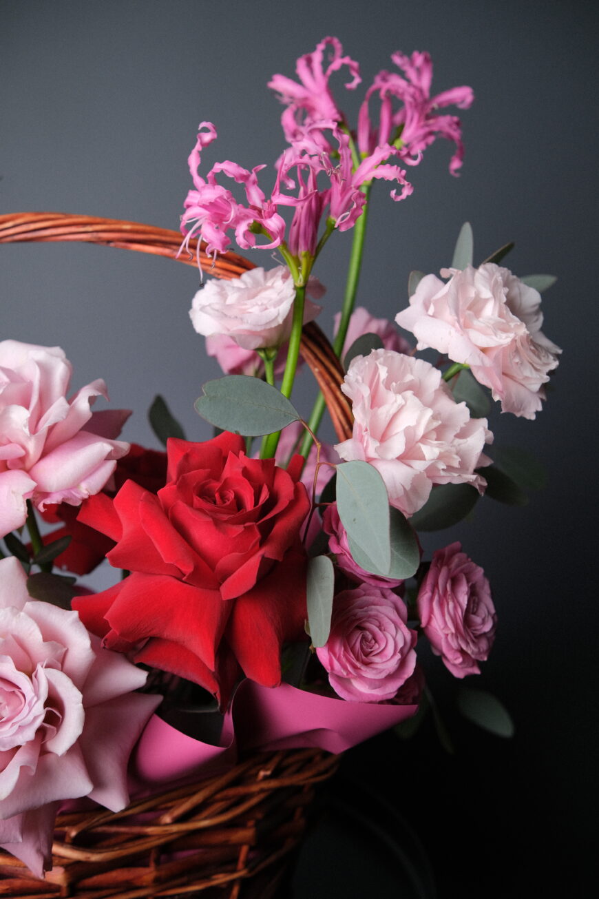 Объемная цветочная композиция в размере М в стильной плетёной корзине.